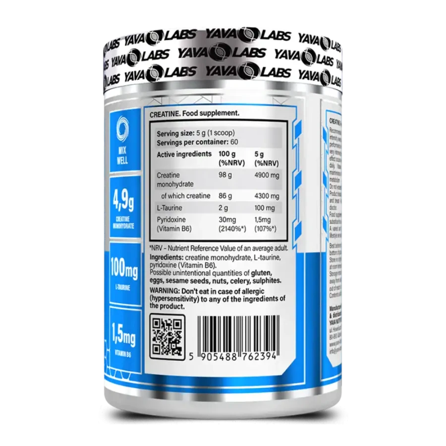 Boost your workout performance with Yava Labs Creatine. This potent supplement is expertly formulated to support an increase in muscle mass and improve overall performance. Each serving delivers 4.9g of Creatine Monohydrate and 100mg of L-Taurine, ingredients known to amplify power during high-intensity workouts. Vitamin B6 is added to facilitate energy metabolism and reduce fatigue. This combination makes Yava Labs Creatine an ideal supplement for those looking to enhance their athletic performance and muscle gains.