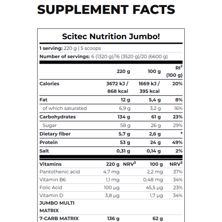 Jumbo, true to its name, helps those looking to bulk up to achieve that calorie surplus more easily with its large portions. It contains 135g of carbohydrates and 53g of protein per serving, significantly increasing the amount of macronutrients consumed in a day and therefore the amount of calories consumed daily.